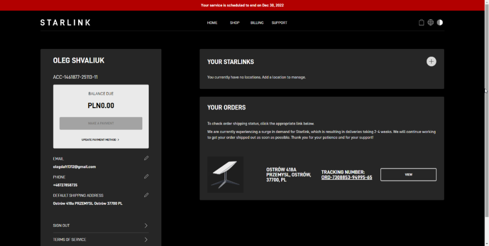 2. Hi. I was trying to transfer ownership from [email protected] to [email protected]. On [email protected] I have received and filled Starlink Transfer of Service form on 07, December. Service on old account stopped 30, December. At the moment new account not created so I cannot start using starlink terminal. Also I cannot add back terminal to old account to recover service. How to get starlink terminal back active ASAP?
