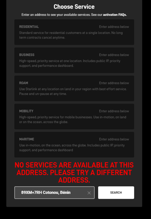 The problem is that every time I enter an address in BENIN, the system tells me that the service is not valid at that address, even though on the official starlink site I see that the area is covered.